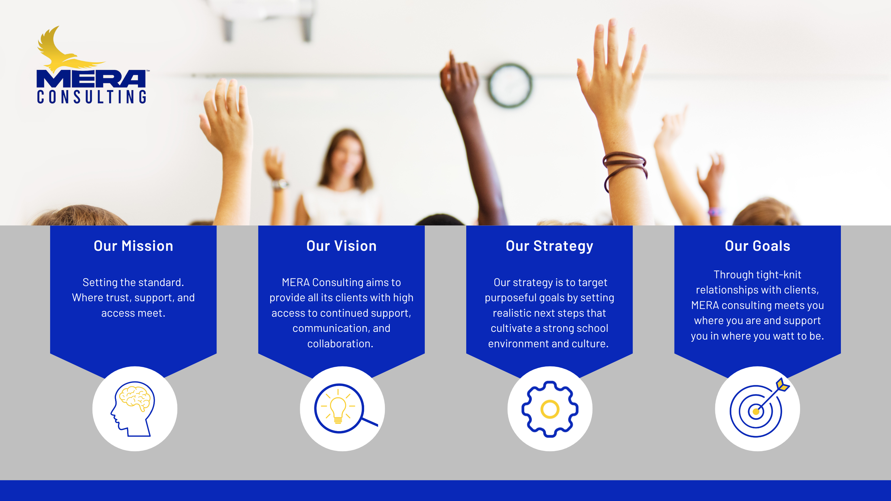 MERA Consulting aims to provide its clients with continuous support, communication, and collaboration. We work closely with schools to meet their needs by providing access on and off site with realistic approaches, transparency, and trust. We believe in meeting schools where they are, to get them to where they want to be.